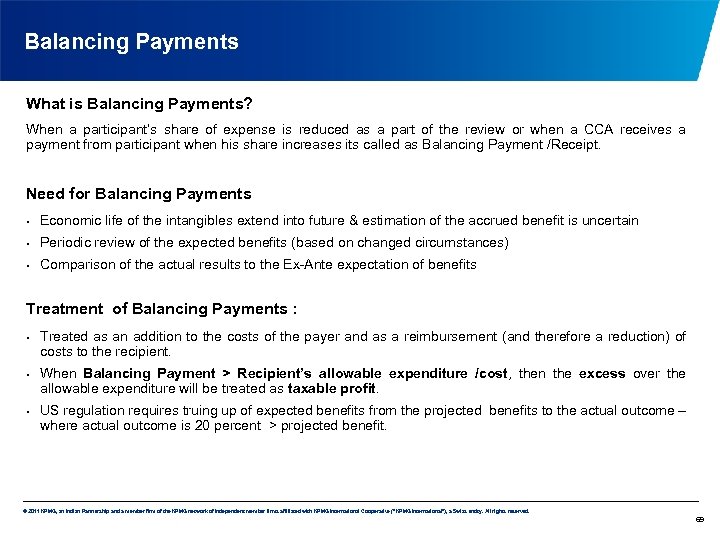 Buy-out adjustments – Key Features • Transfer of interest in the expected results of the CCA • Compensation should consider the impact on the remaining CCA participants • • • Payment must be commensurate with the increase in value of the remaining participant’s consequent to withdrawal At termination, CCA members should receive an interest in the benefits gained from the CCA that is consistent with their contributions throughout the life of the CCA No Buy-out payment in the following cases: Ø Ø When the results of the prior CCA activity do not have any value Where the participants withdrawal results in an identifiable & quantifiable reduction in the value of IP/Assets. © 2011 KPMG, an Indian Partnership and a member firm of the KPMG network of independent member firms affiliated with KPMG International Cooperative (“KPMG International”), a Swiss entity. All rights reserved. 68