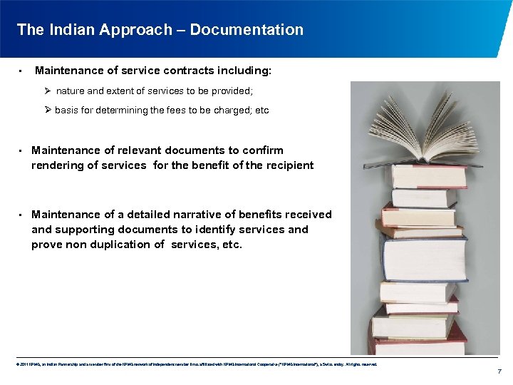 The Indian Approach No specific provisions governing intra-group services are contained in Chapter X of the Income Tax Act, 1961 Indian tax authorities tend to follow the principles set forth in the OECD Guidelines © 2011 KPMG, an Indian Partnership and a member firm of the KPMG network of independent member firms affiliated with KPMG International Cooperative (“KPMG International”), a Swiss entity. All rights reserved. 6 6