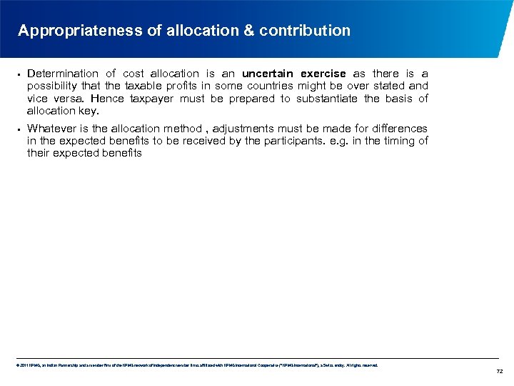 Appropriateness of allocation & contribution • • Allocation of intangible development expense among participants is based on the Allocation Key. Allocation key should be devised in line with the share of benefits to be obtained by each participant § Direct Method Ø Estimated additional income to be generated or costs to be saved by each participant as a result of the arrangement (using projected figures) § Indirect Method Ø Sales Ø Units used/produced/sold Ø Gross or Operating Profits Ø Number of employees Ø Capital invested © 2011 KPMG, an Indian Partnership and a member firm of the KPMG network of independent member firms affiliated with KPMG International Cooperative (“KPMG International”), a Swiss entity. All rights reserved. 71