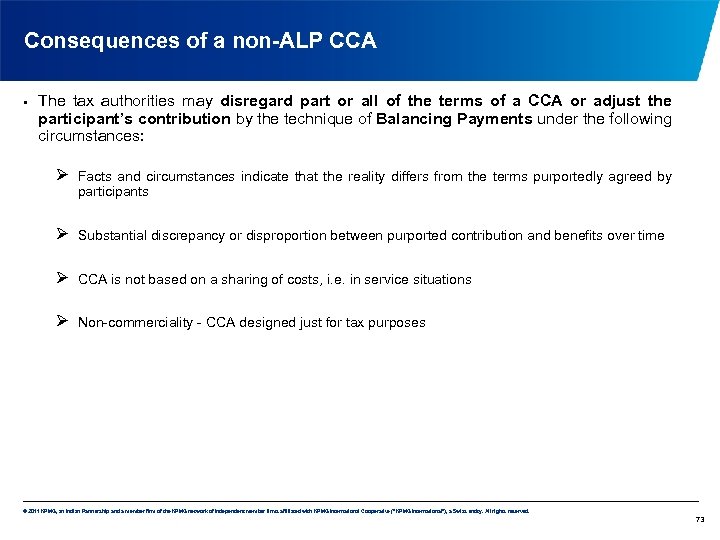 Appropriateness of allocation & contribution • • Determination of cost allocation is an uncertain exercise as there is a possibility that the taxable profits in some countries might be over stated and vice versa. Hence taxpayer must be prepared to substantiate the basis of allocation key. Whatever is the allocation method , adjustments must be made for differences in the expected benefits to be received by the participants. e. g. in the timing of their expected benefits © 2011 KPMG, an Indian Partnership and a member firm of the KPMG network of independent member firms affiliated with KPMG International Cooperative (“KPMG International”), a Swiss entity. All rights reserved. 72