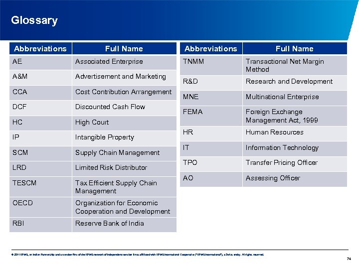 Consequences of a non-ALP CCA • The tax authorities may disregard part or all of the terms of a CCA or adjust the participant’s contribution by the technique of Balancing Payments under the following circumstances: Ø Facts and circumstances indicate that the reality differs from the terms purportedly agreed by participants Ø Substantial discrepancy or disproportion between purported contribution and benefits over time Ø CCA is not based on a sharing of costs, i. e. in service situations Ø Non-commerciality - CCA designed just for tax purposes © 2011 KPMG, an Indian Partnership and a member firm of the KPMG network of independent member firms affiliated with KPMG International Cooperative (“KPMG International”), a Swiss entity. All rights reserved. 73
