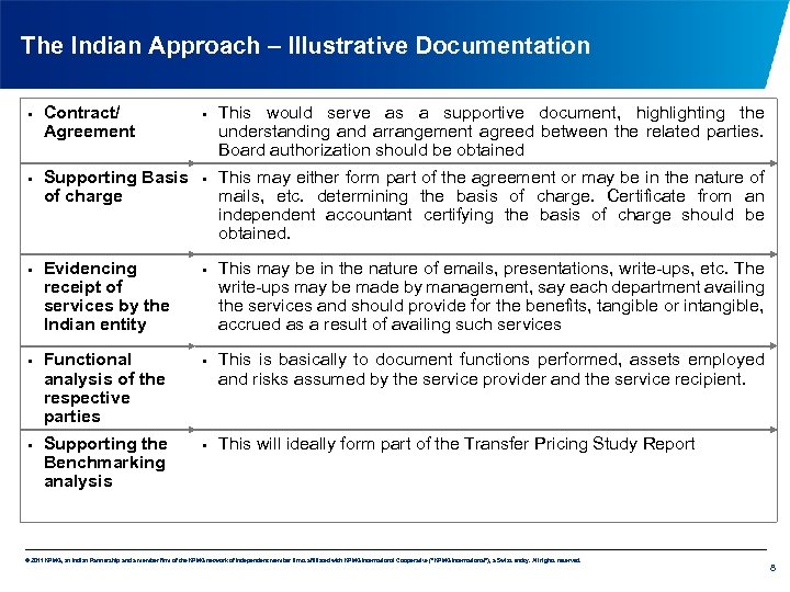 The Indian Approach – Documentation • Maintenance of service contracts including: Ø nature and extent of services to be provided; Ø basis for determining the fees to be charged; etc • Maintenance of relevant documents to confirm rendering of services for the benefit of the recipient • Maintenance of a detailed narrative of benefits received and supporting documents to identify services and prove non duplication of services, etc. © 2011 KPMG, an Indian Partnership and a member firm of the KPMG network of independent member firms affiliated with KPMG International Cooperative (“KPMG International”), a Swiss entity. All rights reserved. 7