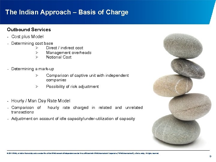 The Indian Approach – Illustrative Documentation • • • Contract/ Agreement Supporting Basis of charge Evidencing receipt of services by the Indian entity Functional analysis of the respective parties Supporting the Benchmarking analysis • • • This would serve as a supportive document, highlighting the understanding and arrangement agreed between the related parties. Board authorization should be obtained This may either form part of the agreement or may be in the nature of mails, etc. determining the basis of charge. Certificate from an independent accountant certifying the basis of charge should be obtained. This may be in the nature of emails, presentations, write-ups, etc. The write-ups may be made by management, say each department availing the services and should provide for the benefits, tangible or intangible, accrued as a result of availing such services This is basically to document functions performed, assets employed and risks assumed by the service provider and the service recipient. This will ideally form part of the Transfer Pricing Study Report © 2011 KPMG, an Indian Partnership and a member firm of the KPMG network of independent member firms affiliated with KPMG International Cooperative (“KPMG International”), a Swiss entity. All rights reserved. 8