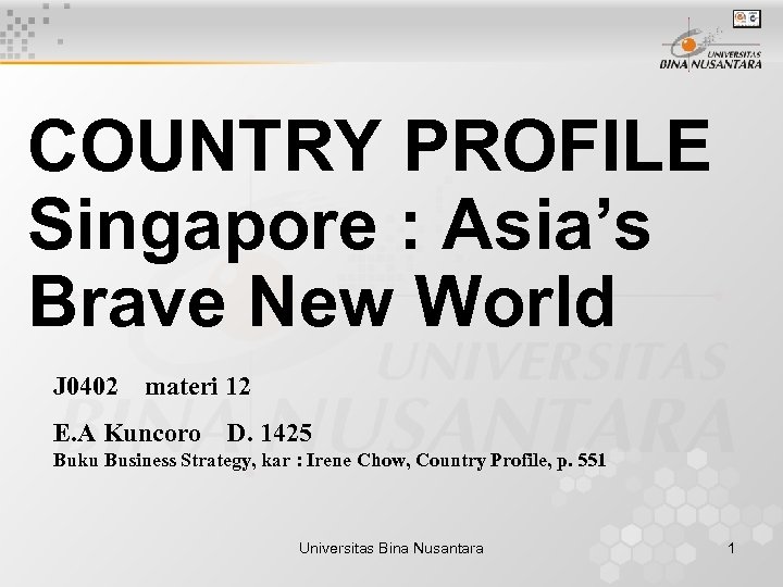 COUNTRY PROFILE Singapore : Asia’s Brave New World J 0402 materi 12 E. A Kuncoro D. 1425 Buku Business Strategy, kar : Irene Chow, Country Profile, p. 551 Universitas Bina Nusantara 1