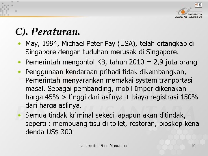 C). Peraturan. • May, 1994, Michael Peter Fay (USA), telah ditangkap di Singapore dengan tuduhan merusak di Singapore. • Pemerintah mengontol KB, tahun 2010 = 2, 9 juta orang • Penggunaan kendaraan pribadi tidak dikembangkan, Pemerintah menyarankan memakai system tranportasi masal. Sebagai pembanding, mobil Impor dikenakan harga 45% > tinggi dari aslinya + biaya registrasi 150% dari harga aslinya. • Semua tindak kriminal sekecil apapun akan ditindak, seperti : membuang tisu di toilet, restoran, bioskop kena denda US$ 300 Universitas Bina Nusantara 10