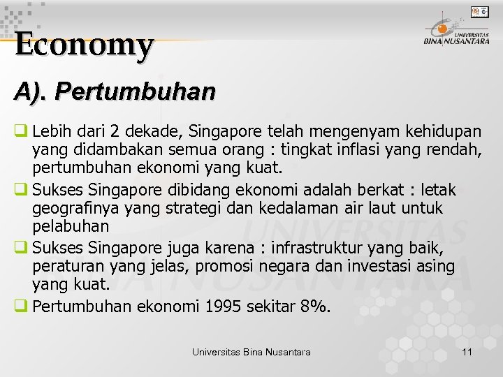 Economy A). Pertumbuhan q Lebih dari 2 dekade, Singapore telah mengenyam kehidupan yang didambakan semua orang : tingkat inflasi yang rendah, pertumbuhan ekonomi yang kuat. q Sukses Singapore dibidang ekonomi adalah berkat : letak geografinya yang strategi dan kedalaman air laut untuk pelabuhan q Sukses Singapore juga karena : infrastruktur yang baik, peraturan yang jelas, promosi negara dan investasi asing yang kuat. q Pertumbuhan ekonomi 1995 sekitar 8%. Universitas Bina Nusantara 11