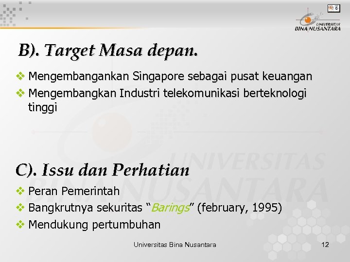B). Target Masa depan. v Mengembangankan Singapore sebagai pusat keuangan v Mengembangkan Industri telekomunikasi berteknologi tinggi C). Issu dan Perhatian v Peran Pemerintah v Bangkrutnya sekuritas “Barings” (february, 1995) v Mendukung pertumbuhan Universitas Bina Nusantara 12