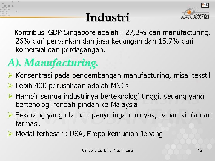 Industri Kontribusi GDP Singapore adalah : 27, 3% dari manufacturing, 26% dari perbankan dan jasa keuangan dan 15, 7% dari komersial dan perdagangan. A). Manufacturing. Ø Konsentrasi pada pengembangan manufacturing, misal tekstil Ø Lebih 400 perusahaan adalah MNCs Ø Hampir semua industrinya berteknologi tinggi, sedang yang bertenologi rendah pindah ke Malaysia Ø Sekarang yang utama : penyulingan minyak, bahan kimia dan farmasi. Ø Modal terbesar : USA, Eropa kemudian Jepang Universitas Bina Nusantara 13