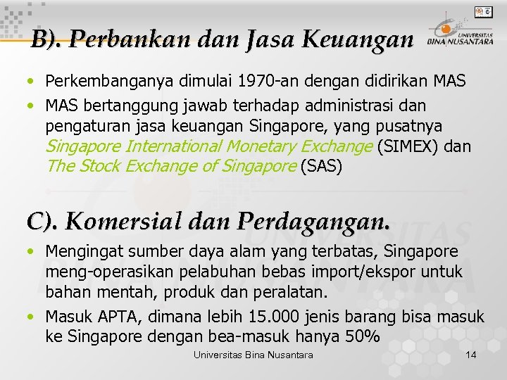 B). Perbankan dan Jasa Keuangan • Perkembanganya dimulai 1970 -an dengan didirikan MAS • MAS bertanggung jawab terhadap administrasi dan pengaturan jasa keuangan Singapore, yang pusatnya Singapore International Monetary Exchange (SIMEX) dan The Stock Exchange of Singapore (SAS) C). Komersial dan Perdagangan. • Mengingat sumber daya alam yang terbatas, Singapore meng-operasikan pelabuhan bebas import/ekspor untuk bahan mentah, produk dan peralatan. • Masuk APTA, dimana lebih 15. 000 jenis barang bisa masuk ke Singapore dengan bea-masuk hanya 50% Universitas Bina Nusantara 14