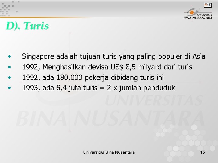 D). Turis • • Singapore adalah tujuan turis yang paling populer di Asia 1992, Menghasilkan devisa US$ 8, 5 milyard dari turis 1992, ada 180. 000 pekerja dibidang turis ini 1993, ada 6, 4 juta turis = 2 x jumlah penduduk Universitas Bina Nusantara 15