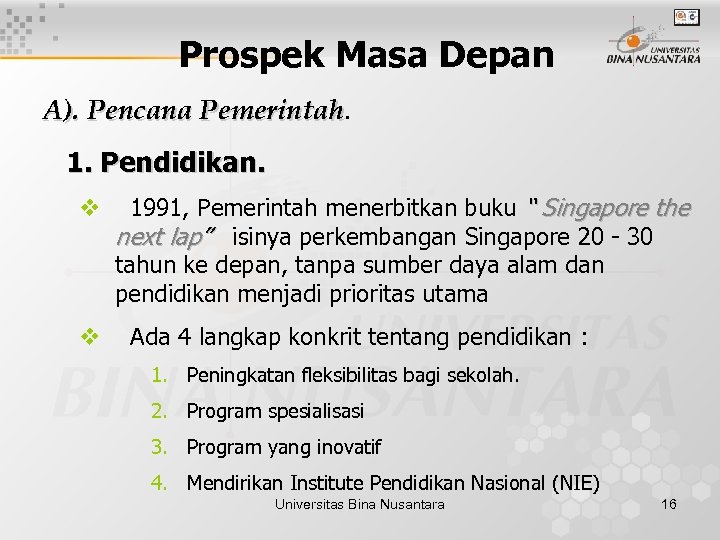 Prospek Masa Depan A). Pencana Pemerintah. 1. Pendidikan. v v 1991, Pemerintah menerbitkan buku “ Singapore the next lap” isinya perkembangan Singapore 20 - 30 tahun ke depan, tanpa sumber daya alam dan pendidikan menjadi prioritas utama Ada 4 langkap konkrit tentang pendidikan : 1. Peningkatan fleksibilitas bagi sekolah. 2. Program spesialisasi 3. Program yang inovatif 4. Mendirikan Institute Pendidikan Nasional (NIE) Universitas Bina Nusantara 16