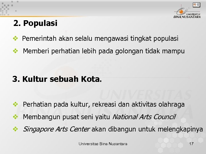 2. Populasi v Pemerintah akan selalu mengawasi tingkat populasi v Memberi perhatian lebih pada golongan tidak mampu 3. Kultur sebuah Kota. v Perhatian pada kultur, rekreasi dan aktivitas olahraga v Membangun pusat seni yaitu National Arts Council v Singapore Arts Center akan dibangun untuk melengkapinya Universitas Bina Nusantara 17