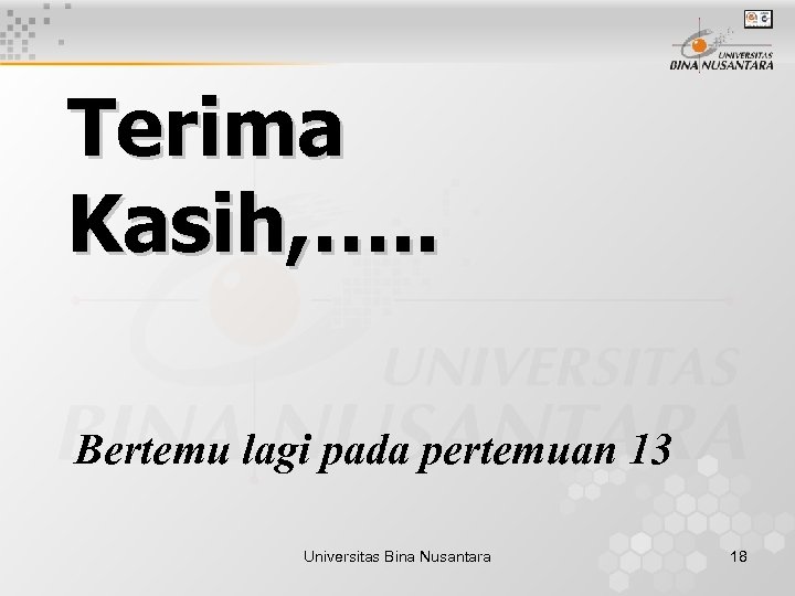 Terima Kasih, …. . Bertemu lagi pada pertemuan 13 Universitas Bina Nusantara 18