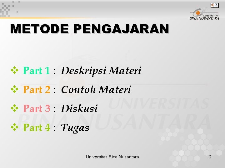 METODE PENGAJARAN v Part 1 : Deskripsi Materi v Part 2 : Contoh Materi v Part 3 : Diskusi v Part 4 : Tugas Universitas Bina Nusantara 2