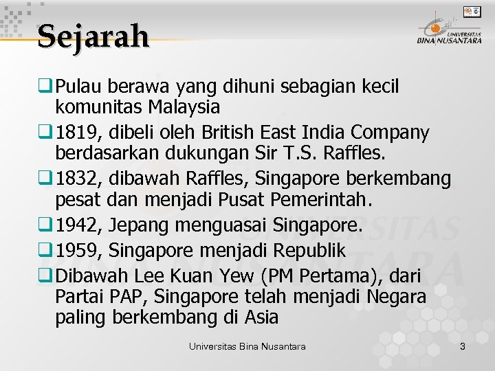Sejarah q Pulau berawa yang dihuni sebagian kecil komunitas Malaysia q 1819, dibeli oleh British East India Company berdasarkan dukungan Sir T. S. Raffles. q 1832, dibawah Raffles, Singapore berkembang pesat dan menjadi Pusat Pemerintah. q 1942, Jepang menguasai Singapore. q 1959, Singapore menjadi Republik q Dibawah Lee Kuan Yew (PM Pertama), dari Partai PAP, Singapore telah menjadi Negara paling berkembang di Asia Universitas Bina Nusantara 3