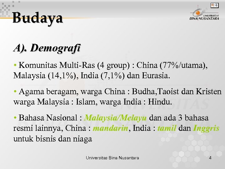 Budaya A). Demografi • Komunitas Multi-Ras (4 group) : China (77%/utama), Malaysia (14, 1%), India (7, 1%) dan Eurasia. • Agama beragam, warga China : Budha, Taoist dan Kristen warga Malaysia : Islam, warga India : Hindu. • Bahasa Nasional : Malaysia/Melayu dan ada 3 bahasa resmi lainnya, China : mandarin, India : tamil dan Inggris untuk bisnis dan niaga Universitas Bina Nusantara 4