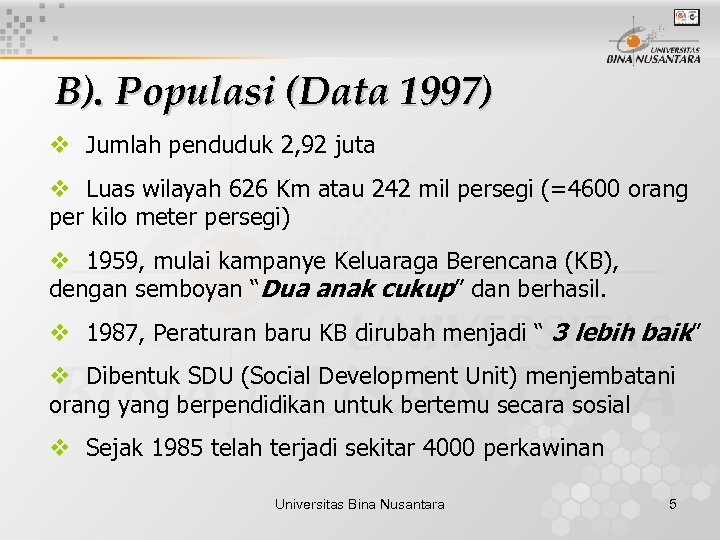 B). Populasi (Data 1997) v Jumlah penduduk 2, 92 juta v Luas wilayah 626 Km atau 242 mil persegi (=4600 orang per kilo meter persegi) v 1959, mulai kampanye Keluaraga Berencana (KB), dengan semboyan “Dua anak cukup” dan berhasil. v 1987, Peraturan baru KB dirubah menjadi “ 3 lebih baik” v Dibentuk SDU (Social Development Unit) menjembatani orang yang berpendidikan untuk bertemu secara sosial v Sejak 1985 telah terjadi sekitar 4000 perkawinan Universitas Bina Nusantara 5
