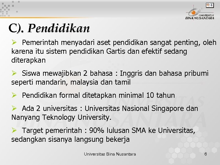 C). Pendidikan Ø Pemerintah menyadari aset pendidikan sangat penting, oleh karena itu sistem pendidikan Gartis dan efektif sedang diterapkan Ø Siswa mewajibkan 2 bahasa : Inggris dan bahasa pribumi seperti mandarin, malaysia dan tamil Ø Pendidikan formal ditetapkan minimal 10 tahun Ø Ada 2 universitas : Universitas Nasional Singapore dan Nanyang Teknology University. Ø Target pemerintah : 90% lulusan SMA ke Universitas, sedangkan sisanya langsung bekerja Universitas Bina Nusantara 6