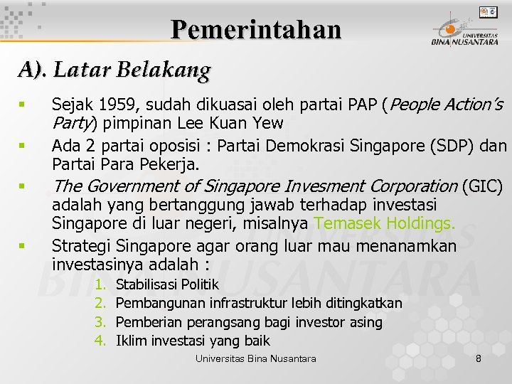 Pemerintahan A). Latar Belakang § § Sejak 1959, sudah dikuasai oleh partai PAP (People Action’s Party) pimpinan Lee Kuan Yew Ada 2 partai oposisi : Partai Demokrasi Singapore (SDP) dan Partai Para Pekerja. The Government of Singapore Invesment Corporation (GIC) adalah yang bertanggung jawab terhadap investasi Singapore di luar negeri, misalnya Temasek Holdings. Strategi Singapore agar orang luar mau menanamkan investasinya adalah : 1. 2. 3. 4. Stabilisasi Politik Pembangunan infrastruktur lebih ditingkatkan Pemberian perangsang bagi investor asing Iklim investasi yang baik Universitas Bina Nusantara 8
