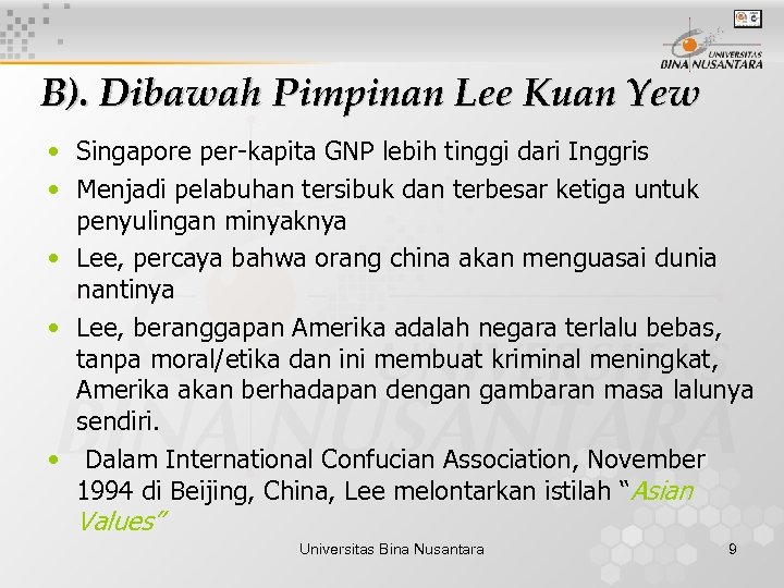 B). Dibawah Pimpinan Lee Kuan Yew • Singapore per-kapita GNP lebih tinggi dari Inggris • Menjadi pelabuhan tersibuk dan terbesar ketiga untuk penyulingan minyaknya • Lee, percaya bahwa orang china akan menguasai dunia nantinya • Lee, beranggapan Amerika adalah negara terlalu bebas, tanpa moral/etika dan ini membuat kriminal meningkat, Amerika akan berhadapan dengan gambaran masa lalunya sendiri. • Dalam International Confucian Association, November 1994 di Beijing, China, Lee melontarkan istilah “Asian Values” Universitas Bina Nusantara 9