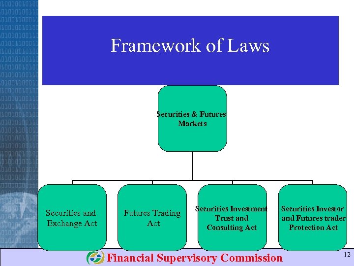 Organization-1 • • • Division 6: Accounting administration Division 7: Futures Division 8: International affairs Auditing Office: securities auditing Legal Affairs Office: compliance and regulations • Information Management Office: information management and computer affairs Financial Supervisory Commission 11