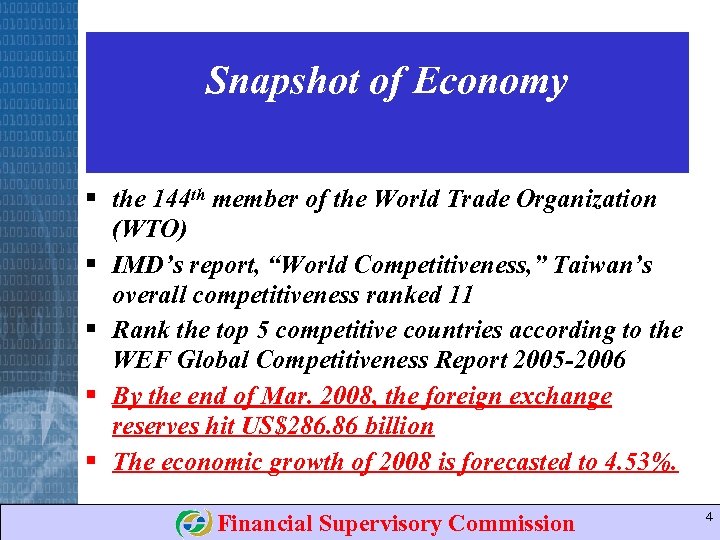Snapshot of Economy § the 144 th member of the World Trade Organization (WTO) § IMD’s report, “World Competitiveness, ” Taiwan’s overall competitiveness ranked 11 § Rank the top 5 competitive countries according to the WEF Global Competitiveness Report 2005 -2006 § By the end of Mar. 2008, the foreign exchange reserves hit US$286. 86 billion § The economic growth of 2008 is forecasted to 4. 53%. Financial Supervisory Commission 4