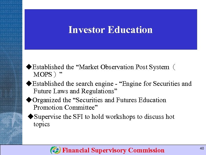 On-line Trading & Supervision (Futures Business) • The FCMs are permitted to accept orders made through the Internet • The FCMs are not required to fill out an individual order form provided that trading order records shall be printed out in order • The FCMs shall record each the trader's Internet Protocol (IP) address and electronic signature issued by a certificate authority • Each FCM shall set up its internet certificate regime Financial Supervisory Commission 39