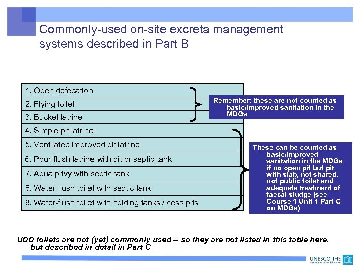 Commonly-used on-site excreta management systems described in Part B 1. Open defecation 2. Flying toilet 3. Bucket latrine Remember: these are not counted as basic/improved sanitation in the MDGs 4. Simple pit latrine 5. Ventilated improved pit latrine 6. Pour-flush latrine with pit or septic tank 7. Aqua privy with septic tank 8. Water-flush toilet with septic tank 9. Water-flush toilet with holding tanks / cess pits These can be counted as basic/improved sanitation in the MDGs if no open pit but pit with slab, not shared, not public toilet and adequate treatment of faecal sludge (see Course 1 Unit 1 Part C on MDGs) UDD toilets are not (yet) commonly used – so they are not listed in this table here, but described in detail in Part C