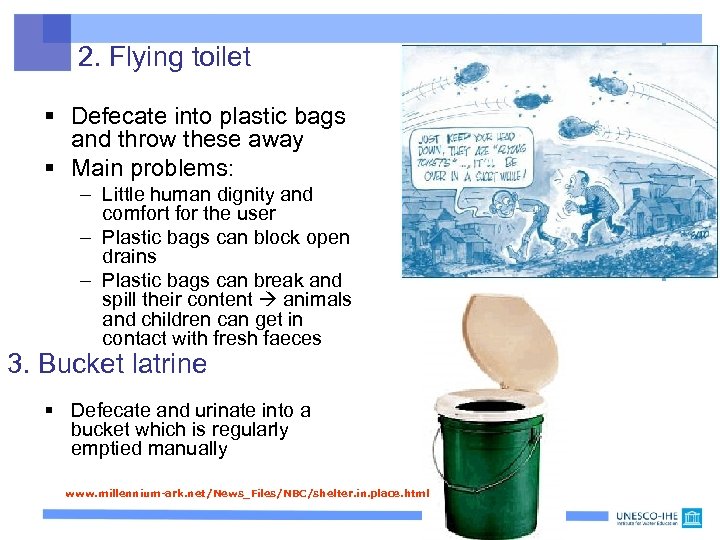 2. Flying toilet § Defecate into plastic bags and throw these away § Main problems: – Little human dignity and comfort for the user – Plastic bags can block open drains – Plastic bags can break and spill their content animals and children can get in contact with fresh faeces 3. Bucket latrine § Defecate and urinate into a bucket which is regularly emptied manually http: //www. millennium-ark. net/News_Files/NBC/shelter. in. place. html