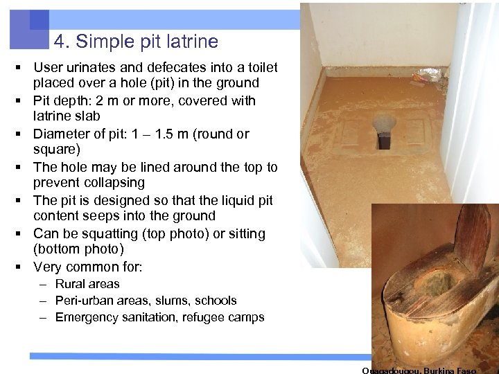 4. Simple pit latrine § User urinates and defecates into a toilet placed over a hole (pit) in the ground § Pit depth: 2 m or more, covered with latrine slab § Diameter of pit: 1 – 1. 5 m (round or square) § The hole may be lined around the top to prevent collapsing § The pit is designed so that the liquid pit content seeps into the ground § Can be squatting (top photo) or sitting (bottom photo) § Very common for: – Rural areas – Peri-urban areas, slums, schools – Emergency sanitation, refugee camps Ouagadougou, Burkina Faso