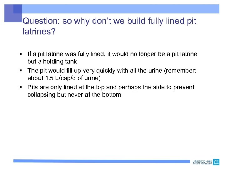 Question: so why don’t we build fully lined pit latrines? § If a pit latrine was fully lined, it would no longer be a pit latrine but a holding tank § The pit would fill up very quickly with all the urine (remember: about 1. 5 L/cap/d of urine) § Pits are only lined at the top and perhaps the side to prevent collapsing but never at the bottom