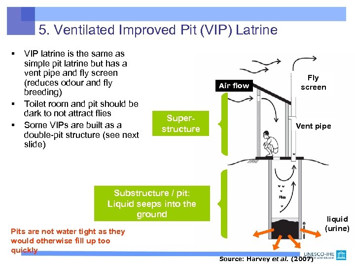 5. Ventilated Improved Pit (VIP) Latrine § § § VIP latrine is the same as simple pit latrine but has a vent pipe and fly screen (reduces odour and fly breeding) Toilet room and pit should be dark to not attract flies Some VIPs are built as a double-pit structure (see next slide) Air flow Superstructure Fly screen Vent pipe Substructure / pit: Liquid seeps into the ground liquid (urine) Pits are not water tight as they would otherwise fill up too quickly Source: Harvey et al. (2007)