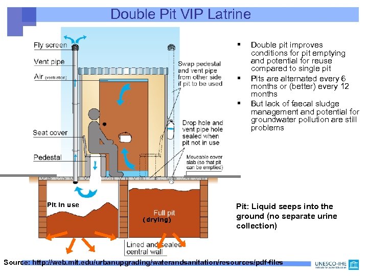 Double Pit VIP Latrine § § § Pit in use (drying) Double pit improves conditions for pit emptying and potential for reuse compared to single pit Pits are alternated every 6 months or (better) every 12 months But lack of faecal sludge management and potential for groundwater pollution are still problems Pit: Liquid seeps into the ground (no separate urine collection) Source: http: //web. mit. edu/urbanupgrading/waterandsanitation/resources/pdf-files