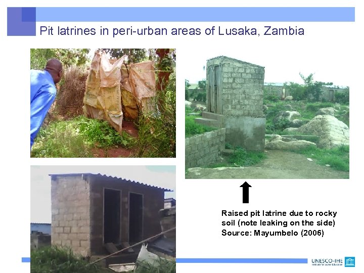Pit latrines in peri-urban areas of Lusaka, Zambia Raised pit latrine due to rocky soil (note leaking on the side) Source: Mayumbelo (2006)