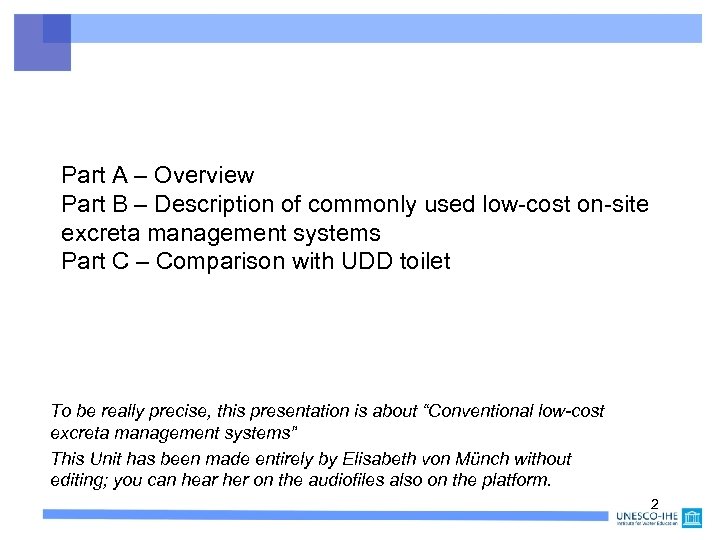 Part A – Overview Part B – Description of commonly used low-cost on-site excreta management systems Part C – Comparison with UDD toilet To be really precise, this presentation is about “Conventional low-cost excreta management systems” This Unit has been made entirely by Elisabeth von Münch without editing; you can hear her on the audiofiles also on the platform. 2