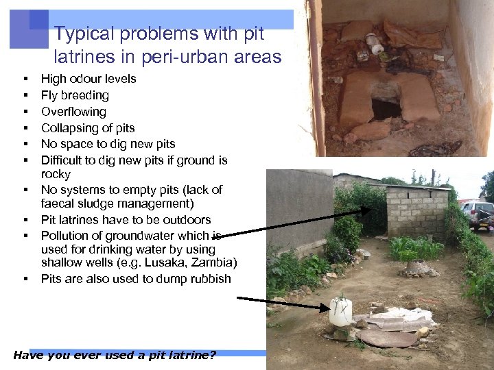 Typical problems with pit latrines in peri-urban areas § § § § § High odour levels Fly breeding Overflowing Collapsing of pits No space to dig new pits Difficult to dig new pits if ground is rocky No systems to empty pits (lack of faecal sludge management) Pit latrines have to be outdoors Pollution of groundwater which is used for drinking water by using shallow wells (e. g. Lusaka, Zambia) Pits are also used to dump rubbish Have you ever used a pit latrine?