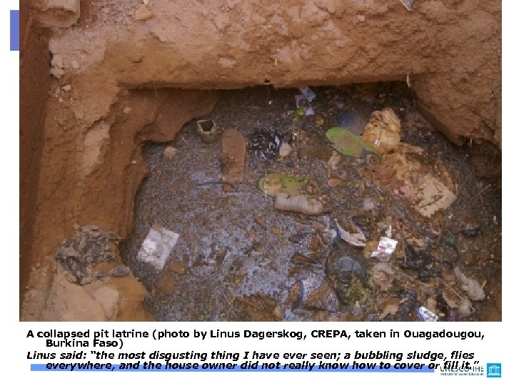 A collapsed pit latrine (photo by Linus Dagerskog, CREPA, taken in Ouagadougou, Burkina Faso) Linus said: “the most disgusting thing I have ever seen; a bubbling sludge, flies everywhere, and the house owner did not really know how to cover or fill it. ”