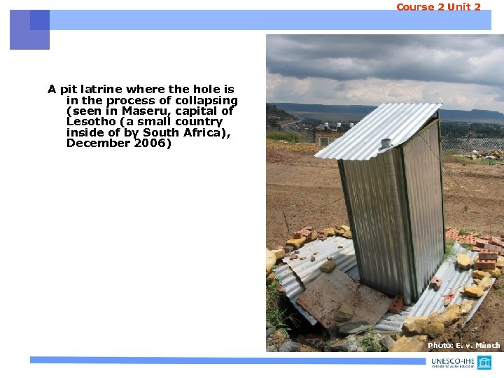 Course 2 Unit 2 A pit latrine where the hole is in the process of collapsing (seen in Maseru, capital of Lesotho (a small country inside of by South Africa), December 2006) Photo: E. v. Münch