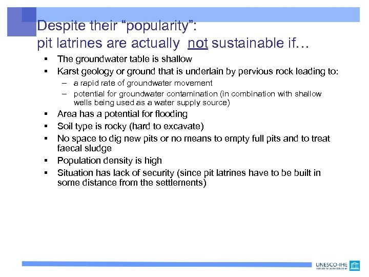 Despite their “popularity”: pit latrines are actually not sustainable if… § § The groundwater table is shallow Karst geology or ground that is underlain by pervious rock leading to: – a rapid rate of groundwater movement – potential for groundwater contamination (in combination with shallow wells being used as a water supply source) § § § Area has a potential for flooding Soil type is rocky (hard to excavate) No space to dig new pits or no means to empty full pits and to treat faecal sludge Population density is high Situation has lack of security (since pit latrines have to be built in some distance from the settlements)
