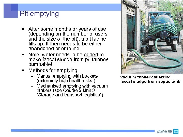 Pit emptying § After some months or years of use (depending on the number of users and the size of the pit), a pit latrine fills up. It then needs to be either abandoned or emptied. § Note: water needs to be added to make faecal sludge from pit latrines pumpable! § Methods for emptying: – Manual emptying with buckets (extremely high health risks!) – Mechanised emptying with vacuum tankers (see Course 2 Unit 3 “Storage and transport logistics”) Vacuum tanker collecting faecal sludge from septic tank