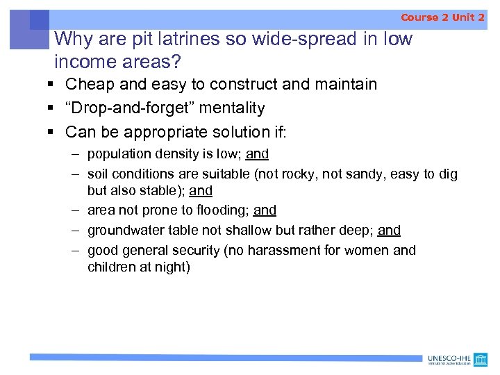Course 2 Unit 2 Why are pit latrines so wide-spread in low income areas? § Cheap and easy to construct and maintain § “Drop-and-forget” mentality § Can be appropriate solution if: – population density is low; and – soil conditions are suitable (not rocky, not sandy, easy to dig but also stable); and – area not prone to flooding; and – groundwater table not shallow but rather deep; and – good general security (no harassment for women and children at night)