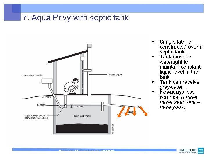7. Aqua Privy with septic tank • • Source: Harvey et al. (2007) Simple latrine constructed over a septic tank Tank must be watertight to maintain constant liquid level in the tank Tank can receive greywater Nowadays less common (I have never seen one – have you? )