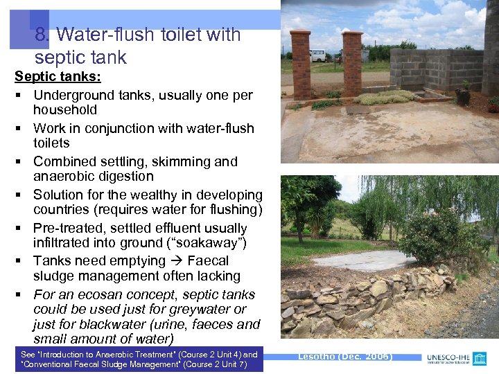 8. Water-flush toilet with septic tank Septic tanks: § Underground tanks, usually one per household § Work in conjunction with water-flush toilets § Combined settling, skimming and anaerobic digestion § Solution for the wealthy in developing countries (requires water for flushing) § Pre-treated, settled effluent usually infiltrated into ground (“soakaway”) § Tanks need emptying Faecal sludge management often lacking § For an ecosan concept, septic tanks could be used just for greywater or just for blackwater (urine, faeces and small amount of water) See “Introduction to Anaerobic Treatment” (Course 2 Unit 4) and “Conventional Faecal Sludge Management” (Course 2 Unit 7) Underground septic tanks in Maseru, Lesotho (Dec. 2006)