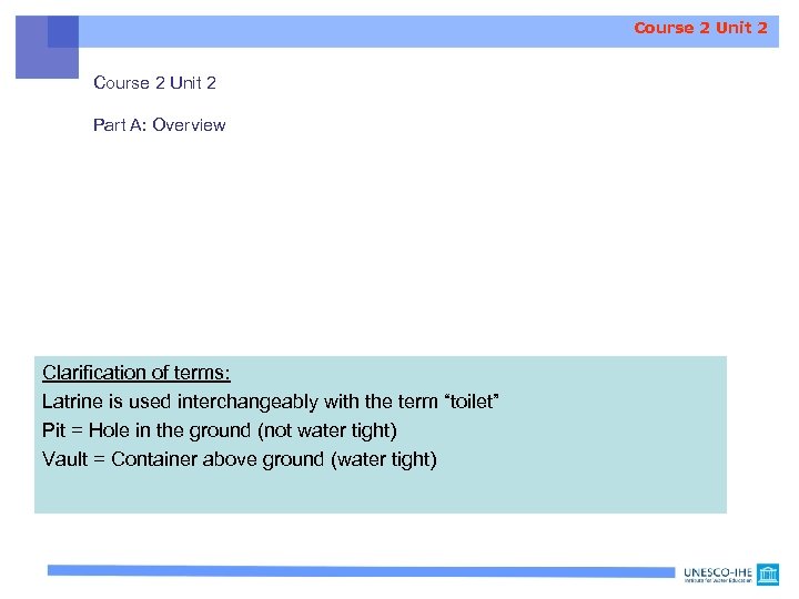 Course 2 Unit 2 Part A: Overview Clarification of terms: Latrine is used interchangeably with the term “toilet” Pit = Hole in the ground (not water tight) Vault = Container above ground (water tight)