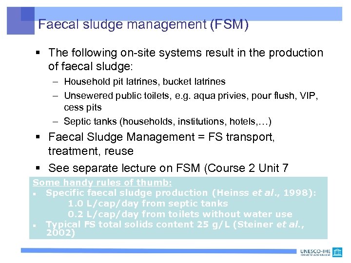 Faecal sludge management (FSM) § The following on-site systems result in the production of faecal sludge: – Household pit latrines, bucket latrines – Unsewered public toilets, e. g. aqua privies, pour flush, VIP, cess pits – Septic tanks (households, institutions, hotels, …) § Faecal Sludge Management = FS transport, treatment, reuse § See separate lecture on FSM (Course 2 Unit 7 Some handy rules of thumb: “Faecal sludge management”) n n Specific faecal sludge production (Heinss et al. , 1998): 1. 0 L/cap/day from septic tanks 0. 2 L/cap/day from toilets without water use Typical FS total solids content 25 g/L (Steiner et al. , 2002)