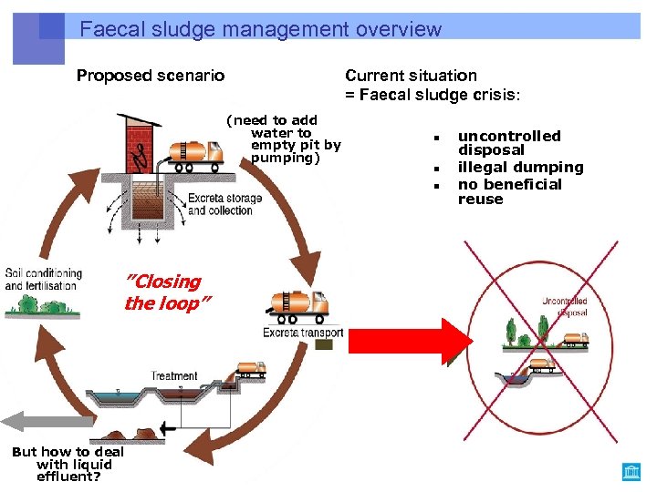 Faecal sludge management overview Proposed scenario Current situation = Faecal sludge crisis: (need to add water to empty pit by pumping) n n n ’’Closing the loop’’ But how to deal with liquid effluent? uncontrolled disposal illegal dumping no beneficial reuse
