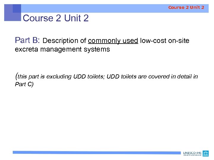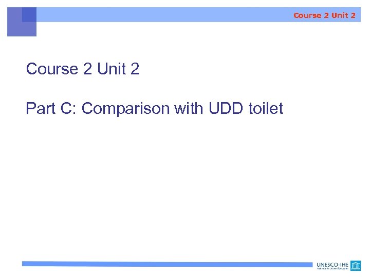 Course 2 Unit 2 Advantages of a UDD toilet compared to a pit latrine § Can be indoors, because: – No pit required (the pit would normally allow liquid to seep into the ground) – No odours (because urine and faeces are not mixed) § Suitable for areas with: – High-density settlements – Difficult soil conditions – A danger of groundwater pollution § Easy to recycle excreta § Does not require faecal sludge management (vacuum tankers for pit emptying) § Does not require regular digging of new pits § Can be more portable (e. g. the Separett foldable UDD toilet shown in Course 1 Unit 3 Part E)