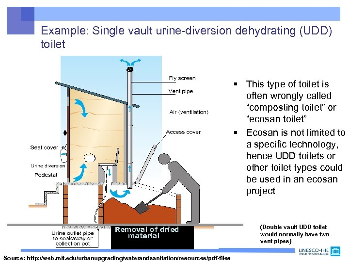 Example: Single vault urine-diversion dehydrating (UDD) toilet § This type of toilet is often wrongly called “composting toilet” or “ecosan toilet” § Ecosan is not limited to a specific technology, hence UDD toilets or other toilet types could be used in an ecosan project Removal of dried material Source: http: //web. mit. edu/urbanupgrading/waterandsanitation/resources/pdf-files (Double vault UDD toilet would normally have two vent pipes)