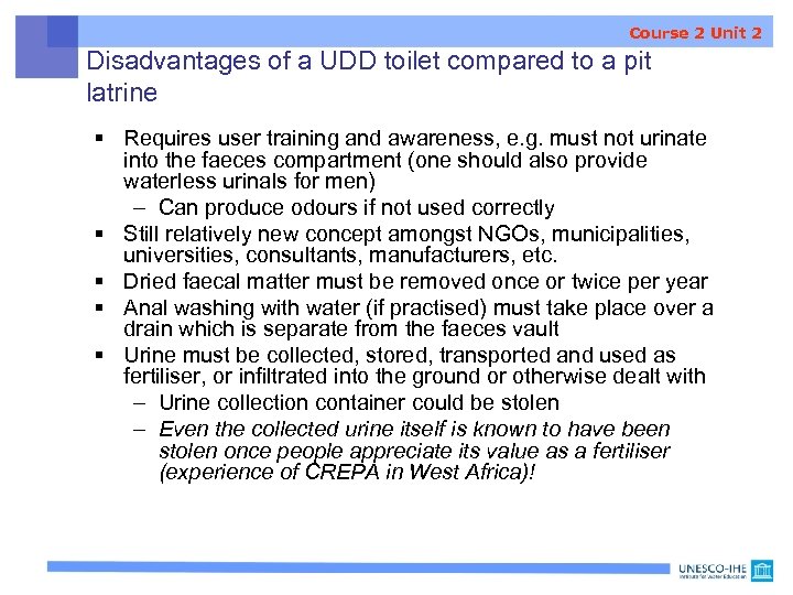 Course 2 Unit 2 Disadvantages of a UDD toilet compared to a pit latrine § Requires user training and awareness, e. g. must not urinate into the faeces compartment (one should also provide waterless urinals for men) – Can produce odours if not used correctly § Still relatively new concept amongst NGOs, municipalities, universities, consultants, manufacturers, etc. § Dried faecal matter must be removed once or twice per year § Anal washing with water (if practised) must take place over a drain which is separate from the faeces vault § Urine must be collected, stored, transported and used as fertiliser, or infiltrated into the ground or otherwise dealt with – Urine collection container could be stolen – Even the collected urine itself is known to have been stolen once people appreciate its value as a fertiliser (experience of CREPA in West Africa)!