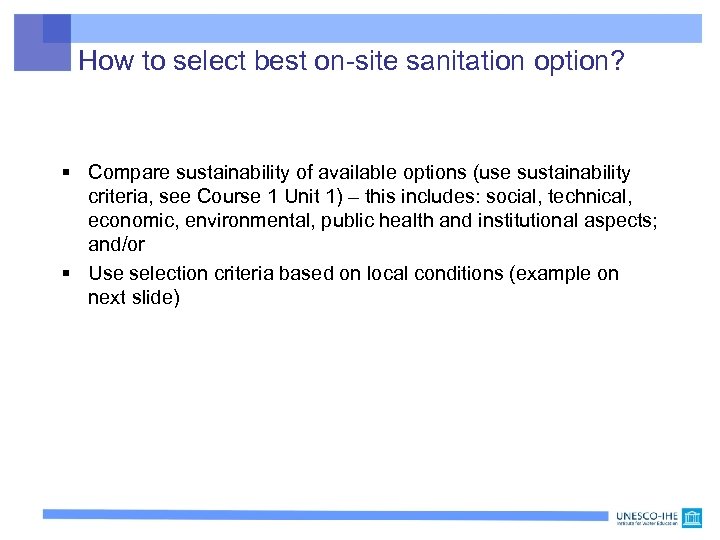 How to select best on-site sanitation option? § Compare sustainability of available options (use sustainability criteria, see Course 1 Unit 1) – this includes: social, technical, economic, environmental, public health and institutional aspects; and/or § Use selection criteria based on local conditions (example on next slide)